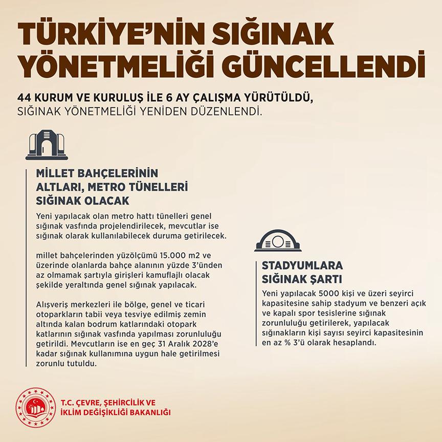 “Halihazırda bizim TOKİ başkanlığımız eliyle yaptığımız tüm binalarda zaten sığınak var. Yani sizin projelerinizde sığınaklarımız mevcut. Diğerleri için de bunu artık zorunlu hale getiriyoruz. Yine işte afet esnasında toplanma alanları olan Millet Bahçeleri, stadyumlar, metro tünelleri gibi bazı alanları da sığınak hizmeti verecek şekliyle inşallah düzenleyeceğiz.”