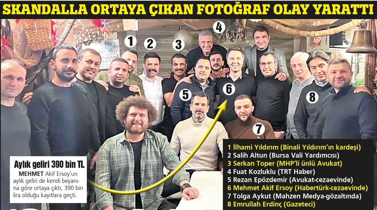 Medyayauzanan uyuşturucu soruşturmasının ikinci dalgasında HaberTürk eski Genel Yayın Yönetmeni Mehmet Akif Ersoy ile birlikte 4 kişi tutuklanmıştı. Gizli bir tanığın ifşasıyla soruşturma dosyasına giren fotoğraf karesi adeta mahalleyi karıştırdı. Fotoğrafta Binali Yıldırım’ın kardeşi İlhan Yıdırım’dan Saray’ın İletişim Başkanlığı Dezenformasyonla Mücadele Merkezi Koordinatörü Furkan Torlak’a, ünlü davaların tutuklu avukatı Rezan Epözdemir’den MHP’li avukat Serkan Toper’e kadar 19 isim yer alıyor.